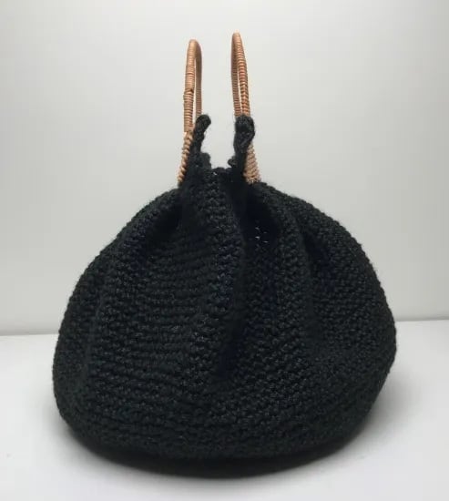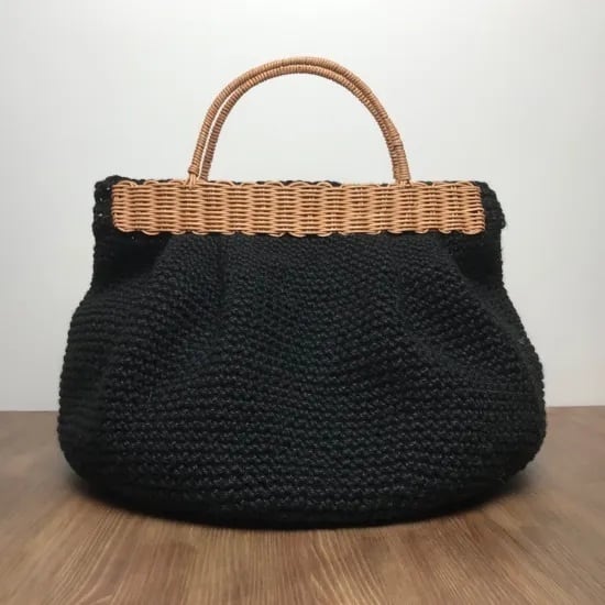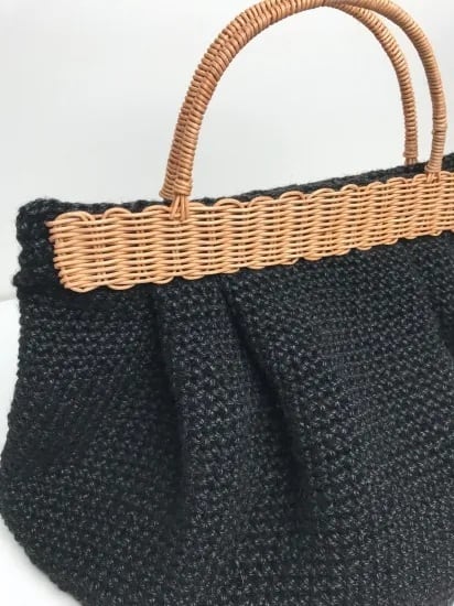 持ち手ラタンの麻紐トートバッグカゴバッグ【タック】無地黒