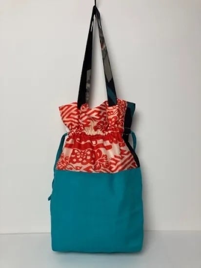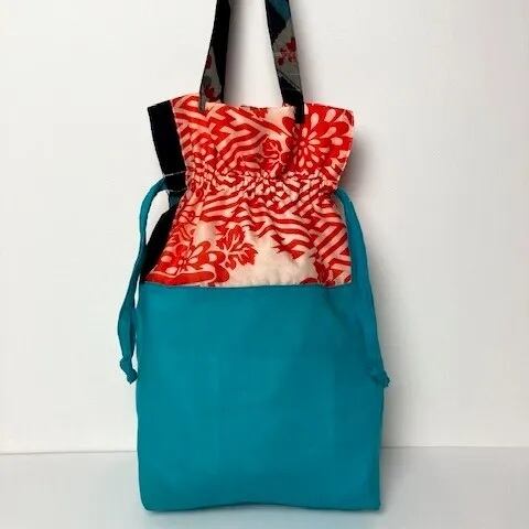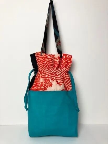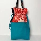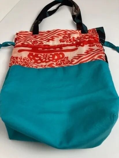 【着物・襦袢リメイク】巾着トートバッグブルー綿・オフ白×赤・紺銘仙