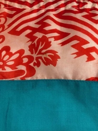 オフ白×赤の生地に小さなシミが一点、ブルーの生地に小さなキズがあります。